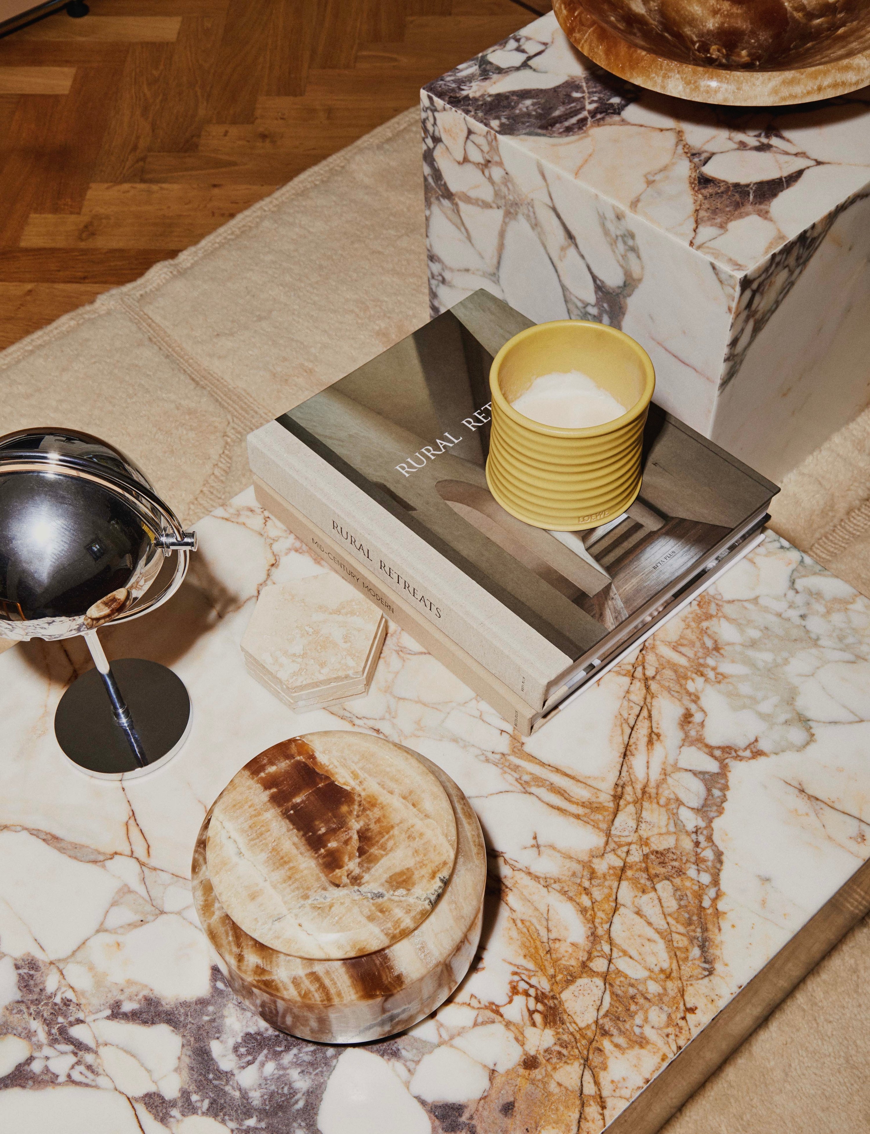 Crafted in brown onyx, we designed two bowls and two decorative pots as refined accents for your interior. The warm tones and subtle translucency of the stone create a calm, sophisticated look. Add a candle to the pots and they cast a soft glow that instantly adds atmosphere. Stylish, iconic pieces that elevate any space with ease.