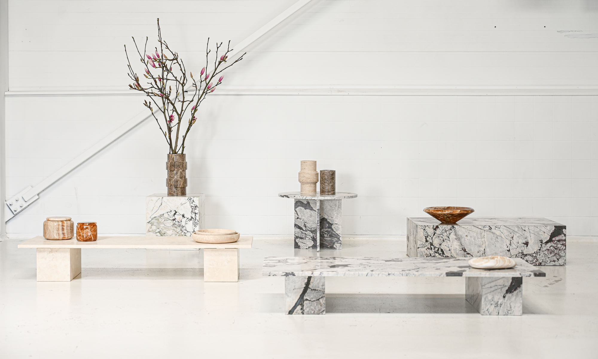 Stoned Objects. A collection of luxurious natural stone statement pieces, like decorative vases and items, large bowls and a range of instant classic tables. All made out of beautiful marble - but also travertine and onyx - sourced from the Aegean coast and the Turkish countryside.